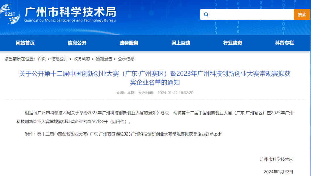 近日,广州市科学技术局公布第十二届中国创新创业大赛(广东·广州赛区)暨2023年广州科技创新创业大赛常规赛拟获奖企业名单。
