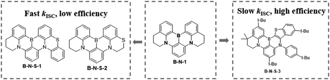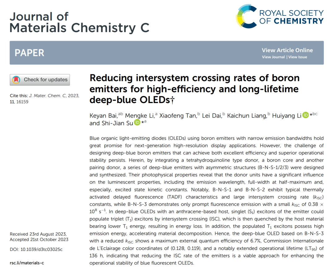 因此,在 TTA 材料为主体的 OLED 器件中,具有慢 KISC 的荧光材料成为最具有优势的客体材料。该成果以“Reducing intersystem crossing rate of boron emitters for high-efficiency and long-lifetime deep-blue OLEDs”(《通过降低B-N结构发光分子的系间窜越速率提高深蓝光 OLED 器件的效率和寿命》)为题,发表在英国皇家化学会期刊 Journal of Materials Chemistry C 上,并入选为 hot article。